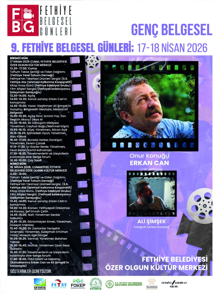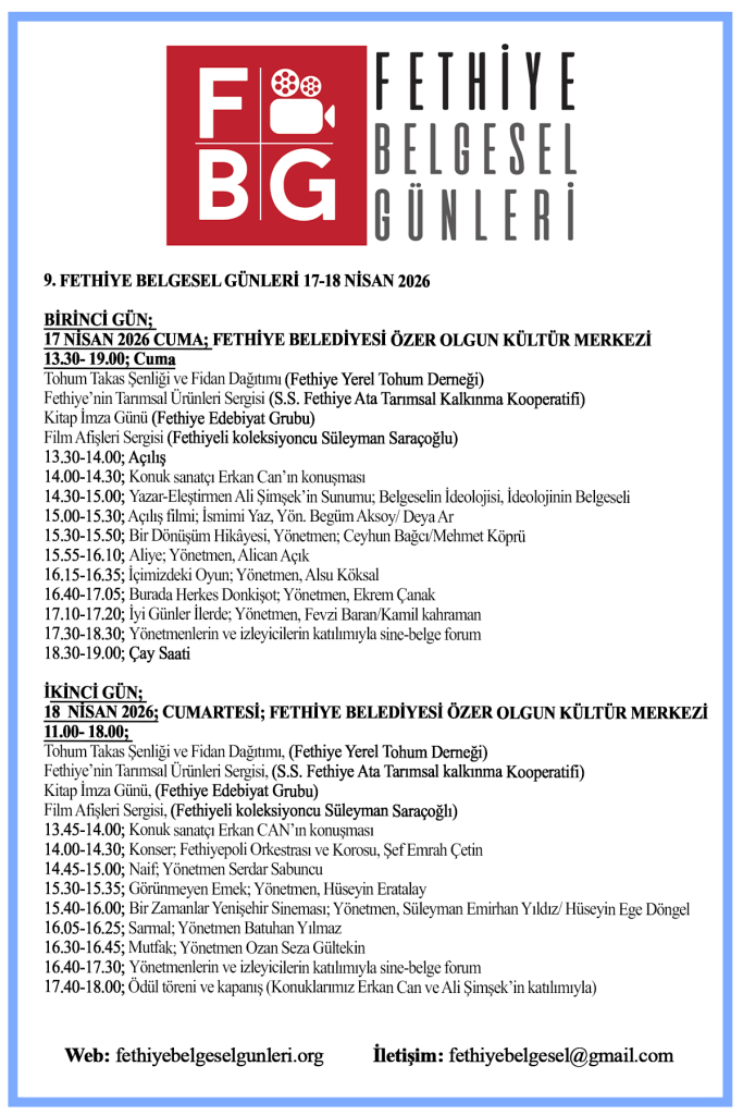 Sekiz yıldır Fethiye’de düzenlenmekte olan “Fethiye Belgesel Günleri” yolculuğu devam ediyor. Bu yıl (2026) 17-18 Nisan 2026 tarihinde, Fethiye Belediyesi Özer Olgun Kültür Merkezi’nde 9. Fethiye Belgesel Günleri gerçekleştirilecektir.