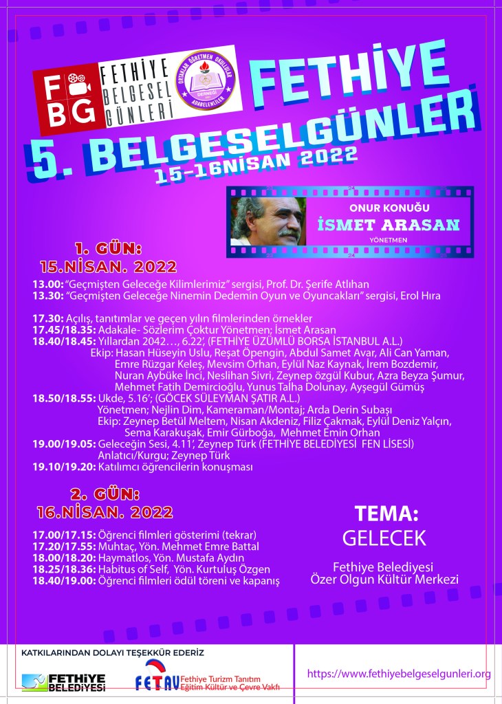 Fethiye Belgesel Günleri’nin beşincisi, 15/16 Nisan 2022 tarihlerinde, Fethiye Belediyesi özer Olgun Kültür Merkezi’nde gerçekleştirildi.